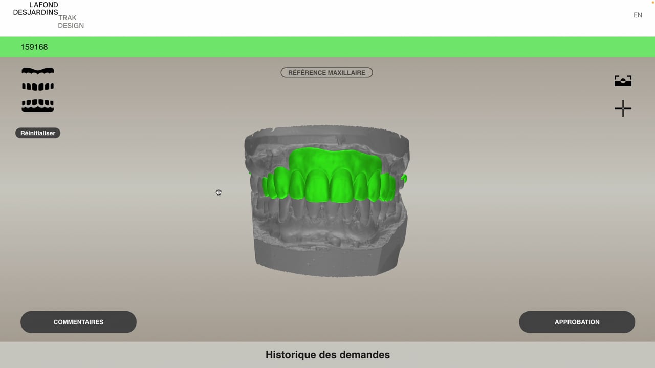 Cette plateforme permet à leur client d'approuver le travail avant de procéder à la production de prothèses dentaires. Les clients peuvent y visualiser un modèle 3D de leur produit et l'examiner comme ils le souhaitent jusqu'à l'approbation finale. La visualisation du modèle est supporté par la technologie Three.js. Elle permet d'agrandir ou de réduire le produit et de le faire tourner sur tous les axes. La couleur de la prothèse est vibrante afin de bien la distinguer du reste des modèles de références de la mâchoire du client.